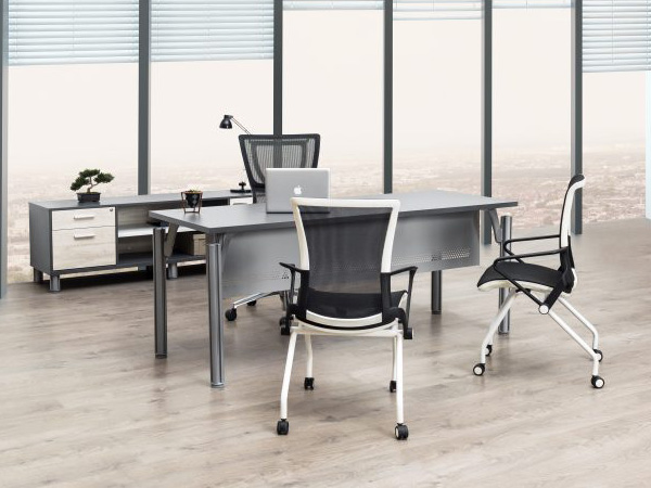 Escritorio rectangular de 4 patas con trabe cubierta y estructura de melamina cubierta con recubrimiento de laminado plástico a baja presión por ambas caras.
